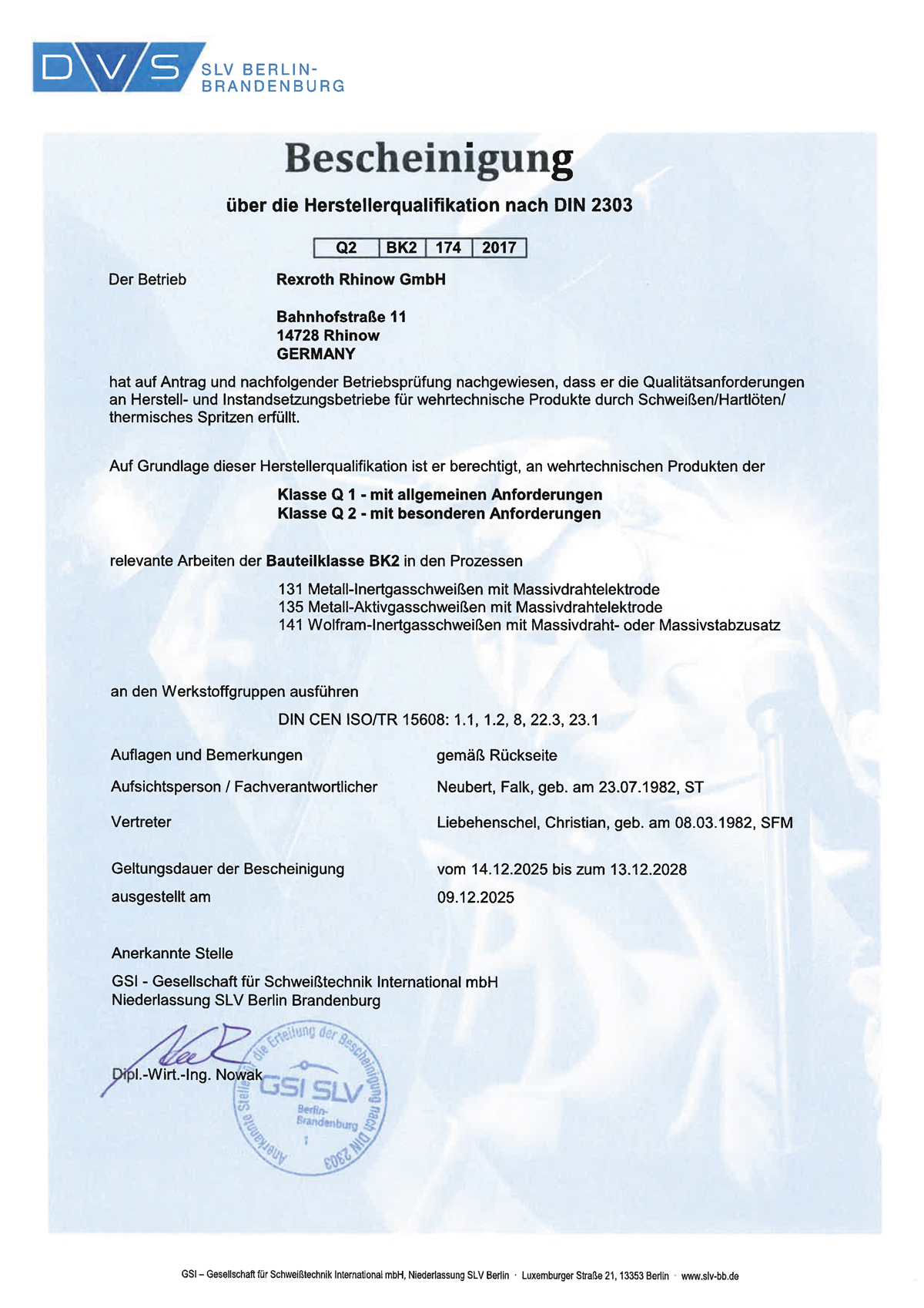 Zertifikate & Bescheinigungen DIN EN ISO 9001:2015 EN 15085-2:2020+A1:2023 DIN 2303 – von 2025 bis 2028 EN 17460 :2025